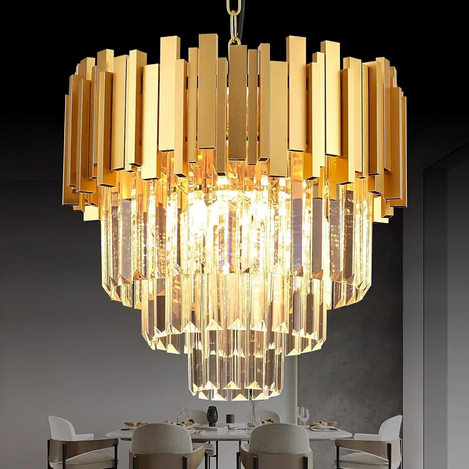 HUA QIANG WANG Crystal Chandeliers Modern 3-Tier Flush Mount Ceiling Light Raindrop 15.7” Crystal Chandelier Gold Crystal Pendant Light for Dining Room Living Room Bedroom(Bulb Not Included)